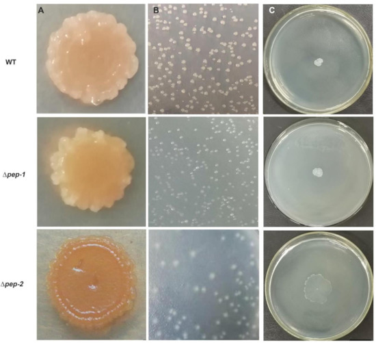 The colony biofilm, colony morphology and motility of P. polymyxa WLY78 (WT), pep-1 and pep-2 gene cluster. (A) Colony biofilm of WT, ∆pep-1 and ∆pep-2 after 120 h of cultivation. (B) Colony morphology of WT, ∆pep-1 and ∆pep-2 after 18 h of cultivation. (C) Twitching motility assays of WT, ∆pep-1 and ∆pep-2 after 24 h of cultivation at 30 °C. Results are representative of at least three independent experiments.