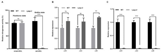 Effect of biofilm formation defect on nitrogenase activity under aerobic conditions. (A) The influence of biofilm on the nitrogenase activity under anaerobic condition in the planktonic state or under aerobic conditions in the biofilm state. (B) qRT-PCR analysis of the relative mRNA levels of the nifHDK genes in the WT and ∆pep-2 strains under anaerobic condition in the planktonic state. (C) qRT-PCR analysis of the relative mRNA levels of the nifHDK genes in the WT and ∆pep-2 strains under aerobic condition in the biofilm state. Relative nitrogenase activity and relative mRNA levels of each sample were normalized to those of the WT sample. Results are representative of at least three independent experiments. Error bars indicate SD. Ns indicates nonsignificant. ** indicates p < 0.01. *** indicates p < 0.001.