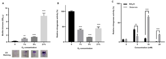 Here, we tested the effect of oxygen concentration on biofilm formation and nitrogenase activity in biofilms. Assays for biofilm formation and nitrogenase activity of P. polymyxa WLY78 were simultaneously performed after growing the bacterial cells in the static liquid culture at 30 °C for 7 days. Only a small amount of biofilm was formed in the absence of oxygen, and the highest amount of biofilm was produced when oxygen concentration was 21% (aerobic condition) (Figure 6A). In contrast, the highest nitrogenase activity was observed in absence of oxygen, in agreement with our previous reports that this bacterium exhibited the highest nitrogenase activity in anaerobic conditions [33]. Notably, nitrogenase activity was observed in the condition of 21% oxygen where biofilm was produced (Figure 6B), suggesting that biofilm provides the micro-aerobic conditions for nitrogenase.