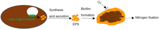 Taken together, P. polymyxa WLY78 can form biofilm at the air–liquid interface and the colony biofilms on solid medium. EPS are the major component of the extracellular matrix. The pep-2 operon, comprising 17 putative genes (pepA-pepN), is involved in EPS biosynthesis and biofilm formation, but the pep-1 cluster composed of 12 genes (pepO-ltyR) is not. Biofilm formation mediated by EPS enables P. polymyxa WLY78 to fix nitrogen under aerobic conditions (Figure 7).
