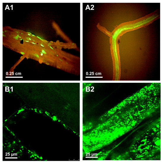 Colonization of potato roots with green fluorescent protein (GFP)-tagged Dickeya solani. Bacterial colonization of roots can be evaluated using either epifluorescence stereo microscopy to visualize the spread of the D. solani strain IPO2254 (see Table 1) on the scale of the organ (microcolonies on the rhizoplane and invasion of the vascular tissue, (A1,A2), respectively) or by confocal scanning laser microscopy to locate the bacterium on the level of the plant cell (intercellular and intracellular colonization, (B1,B2), respectively). For technical experimental details please see reference [97]. (Courtesy of Dr. Jan van der Wolf, WUR-PRI, Wageningen, the Netherlands).