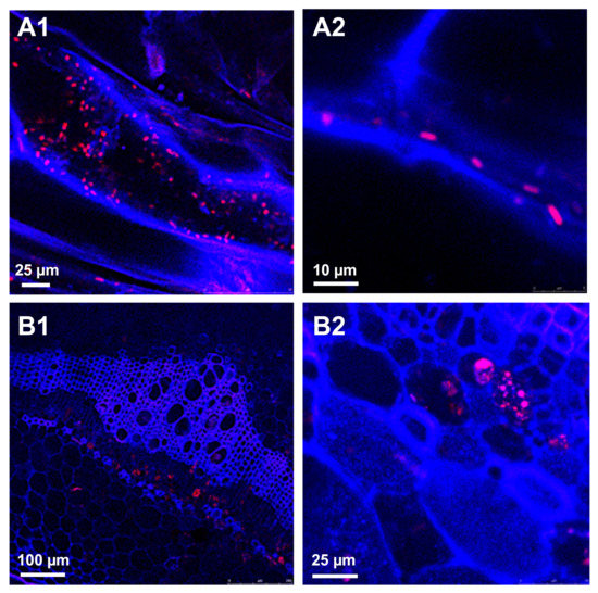 Colonization of potato roots and stems with DsRed-tagged Dickeya solani. DsRed fluorescent protein is a relevant alternative to the widely used green fluorescent protein (GFP) for tagging soft-rot Pectobacteriaceae. In this example, the peak emission of DsRed (610 nm), very far from that of the autofluorescence of plant cell walls (450 nm), allowed fine localization of D. solani IPO3012 (see Table 1) red cells and microcolonies, both in the blue cells and walls of the roots (A1,A2) and stems (B1,B2). For technical experimental details please see reference [125]. (Courtesy of Dr. Jan van der Wolf, WUR-PRI, Wageningen, the Netherlands).