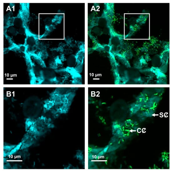 Simultaneous observation of the location and quorum-sensing communication of Pectobacterium atrosepticum during potato tuber soft-rot. Tubers were wounded and inoculated axenically with the P. atrosepticum CFBP6276 dual-colored strain (see Table 1): the constitutively produced cyan fluorescent protein served as a cell tag (blue fluorescing cells), whereas reporter fusion based on the green fluorescent protein (GFP) enabled the simultaneous recording of the production and presence of N-acyl-homoserine lactone (AHL) signaling molecules (green fluorescing cells). Confocal microscopy observations of the bottom surface of the tuber wound were achieved at two days post-inoculation with an ultrathin cross-section. Images were combined in the blue and red channels (A1,B1), supplemented with the green channel (A2,B2). In these conditions, slight blue (A1,B1) or celadon (A2,B2) autofluorescence revealed the cell wall structure of the pith, as well as translucent parenchyma cells containing opaque and oval amyloplasts. Close-ups (delineated by squares) of clustered and embedded pectobacterial cells in (A1,A2) are shown in (B1,B2), respectively. Legend: CȻ, communicating cell, SȻ, silent cell. For technical experimental details please see reference [103].