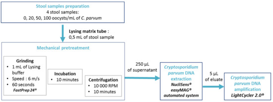 This study was conducted between 27 July to 5 September 2020 at the parasitology laboratory of the University Hospital of Dijon, which has proficiencies in the molecular detection of Cryptosporidum sp. DNA from stools. The step-by-step protocol is detailed in Figure 1.