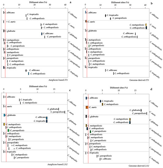 The same analyses described above were carried out with the pathogenic species of the genus Candida—among which, three species (C. parapsilosis, C. metapsilosis and C. orthopsilosis) were derived from the splitting of the former C. parapsilosis species [32]. Furthermore, C. glabrata is phylogenetically different from the others, stemming from whole-genome duplication [33]. The internal distances of all Candida species (as resulting from the datasets employed) were much smaller than the distances among the various species. In fact, interspecific distances were up to 25% and 40% for the standard and genomic ITS and up to 15% for both types of LSU sequences. C. metapsilosis could not be separated from C. orthopsilosis with any of the two markers, irrespective of the sequencing method used (Figure 2). In general, the internal variability of the genomic sequences was higher than that of the corresponding amplicon-based.