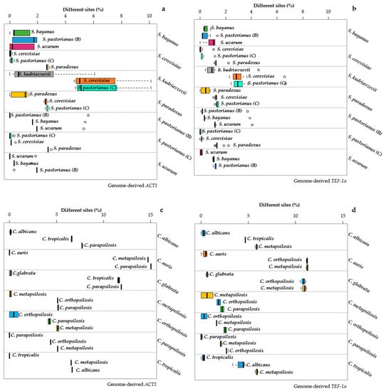 S. kudriavzevii showed a relatively low average (0.25%) but a large range (>3%) of the distances between its strains and the type, confirmed by a large variability when these strains are compared with the types of S. pastorianus and S. cerevisiae. This could be due either to the presence of incorrectly identified strains or to the poor quality of the genomes. A similar case was present with the ACT1 of C. orthopsilosis (Figure 4c), where the strains showed variability only against their own type strain, whereas they showed larger distances with the types of C. parapsilosis and C. metapsilosis. These two cases showed that, when the distances between species are large, even a high internal variability does not limit the species separation.