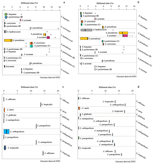 Distance among and within the Candida and Saccharomyces species. Resolutions calculated for genomic RPB1 and genomic RPB2 of Saccharomyces are displayed in panels (a,b), respectively. Genomic RPB1 and genomic RPB2 of Candida are reported in panels (c,d). Each subpanel reports the distances of the strains belonging to the species under study (indicated on the right of the subpanel) with the sequences of the type strain of the three closest species (indicated close to the box). The width of each box represents the variability of the distances of the strains of each species from the type strains of the three closest species. The internal variability of each species is indicated by the topmost box of each subpanel. The distances among the means of the species are displayed as the distances between the vertical thick segments within the boxes.