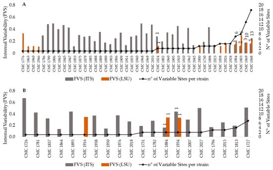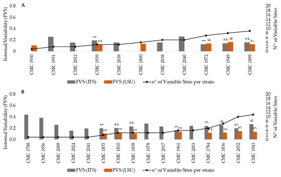 On the contrary, the analysis carried out on C. tropicalis strains showed that 16 out of the 19 strains sequenced displayed at least one site with more than 10% variants (Figure 3B). Despite this high number of strains with variant reads, the intragenomic variability was similar to that described above for C. parapsilosis both in terms of distribution of variant sites (1–6 sites ITS; 1-8 ITS-LSU) and of LSU AFVS values (0.15 vs. 0.15). Conversely, a greater number of variants per variable site was detected in the ITS sequences (0.26 vs. 0.18) (Table S5).