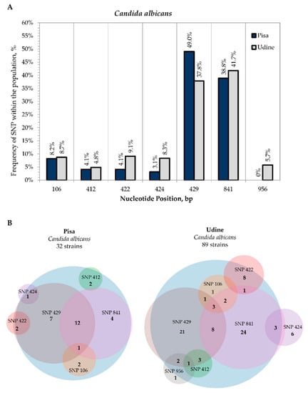 Internal variability of C. albicans species (SNPs). (A): Frequency of SNP within the population (y-axis) vs. nucleotide position (x-axis). For both sampling sites, SNP frequencies were calculated on the basis of the coverage in the multiple sequence alignment of all the second-level consensus sequences with the type strain. Frequencies of SNPs from Pisa Hospital (blue columns) and Udine Hospital (grey columns). (B): Venn diagrams of strains isolated from Pisa Hospital and Udine Hospital that displayed the presence of SNPs.