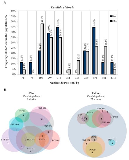 Internal variability of C. glabrata species (SNPs). (A): Frequency of SNP within the population (y-axis) vs. nucleotide position (x-axis). For both sampling sites, SNP frequencies were calculated on the basis of the coverage in the multiple sequence alignment of all the second-level consensus sequences with the type strain. Frequencies of SNPs from Pisa Hospital (blue columns) and Udine Hospital (grey columns). (B): Venn diagrams of strains isolated from Pisa Hospital and Udine Hospital that displayed the presence of SNPs.