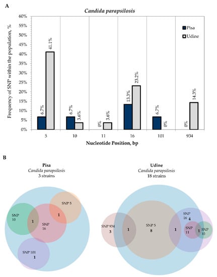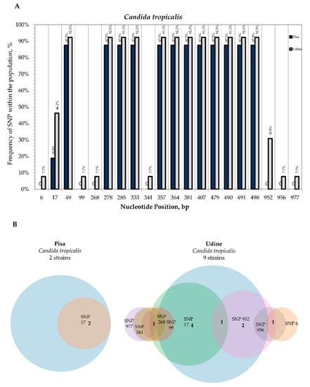 Internal variability of C. tropicalis species (SNPs). (A) Frequency of SNPs within the population (y-axis) vs. nucleotide position (x-axis). For both sampling sites, SNP frequencies were calculated on the basis of the coverage in the multiple sequence alignment of all the second-level consensus sequences with the type strain. Frequencies of SNPs from Pisa Hospital (blue columns) and Udine Hospital (grey columns). (B) Venn diagrams of strains isolated from Pisa Hospital and Udine Hospital that displayed the presence of SNPs not related to the type strain sequences.
