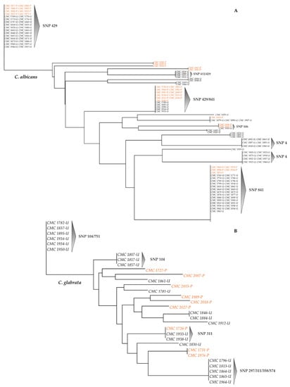 Neighbor-joining phylogenetic trees based on SNP profiles. (A) C. albicans neighbor-joining phylogenetic tree; (B) C. glabrata neighbor-joining phylogenetic tree. Black plain characters: Udine Hospital; orange plain characters: Pisa Hospital.