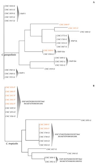 Neighbor-joining phylogenetic trees of the C. parapsilosis and C. tropicalis strain sets. (A) C. parapsilosis neighbor-joining phylogenetic tree; (B) C. tropicalis neighbor-joining phylogenetic tree. Black plain characters: Udine Hospital; orange plain characters: Pisa Hospital.