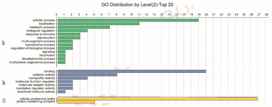 Gene Ontology (GO) analysis of the 54 Asia II 1 whitefly proteins that putatively interact with the CLCuMuV CP, as indicated by the yeast two-hybrid system. Different colors represent different GO categories (BP: biological process; MF: molecular function; CC: cellular components). GO annotation was conducted using Blast2GO software, and the figure was generated using OmicShare tools (http://www.omicshare.com/tools).