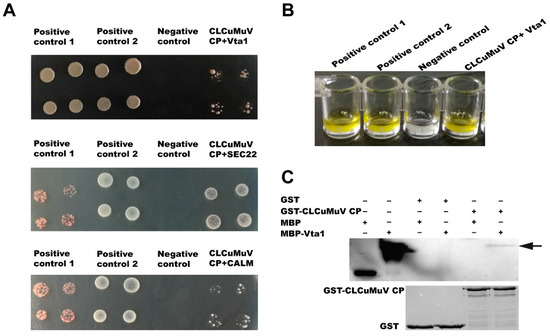 For verification of the interaction between the CLCuMuV CP and prey proteins, we selected the five proteins in the GO category vesicle-mediated transport (GO:0016192) for further analysis using the yeast two-hybrid system. The full-length open reading frames of the five genes were amplified and ligated into pPR3-N, and then these prey plasmids and the bait plasmid pDHB1-CLCuMuV CP were co-transformed into yeast cells. Among the five proteins, the full lengths of calmodulin (CALM), vesicle transport protein SEC22 (SEC22), and vacuolar protein sorting-associated protein (Vps) twenty associated 1 (Vta1) were found to interact with the CLCuMuV CP (Figure 2A). Since Vta1 has been reported to regulate virus–host interactions, we subjected it to further analysis [22,23]. Analysis of beta-gal activity confirmed the interaction between Vta1 and the CLCuMuV CP (Figure 2B). And in the pull-down assay, when the fusion protein GST-CLCuMuV CP was used as a bait protein and the fusion protein MBP-Vta1 used as the prey protein, the prey protein could co-elute with the GST-fused CLCuMuV CP (Figure 2C). These results suggest that Vta1 from Asia II 1 whitefly can interact with the CLCuMuV CP both in vivo and in vitro.