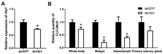 DNA templates for dsRNA synthesis were amplified by PCR using primers with the T7 promoter at both ends, namely Vta1 (Asia II 1)-T7-F, Vta1 (Asia II 1)-T7-R, Vta1 (MEAM1)-T7-F, and Vta1 (MEAM1)-T7-R (Table S1). DsRNA synthesis was conducted with a T7 high-yield RNA transcription kit (Vazyme, Nanjing, China). Next, dsRNA was purified, and the quality and concentration were determined using agarose gel electrophoresis and Nanodrop (Thermo Fisher, Waltham, MA, USA). For membrane feeding, dsRNA-targeting Vta1 or GFP (control) was added to 15% sucrose solution to make the final concentration 200 ng/μL. Whiteflies were collected and released into artificial diet feeding chambers, as described before [8]. The duration of membrane feeding was 48 h.