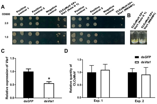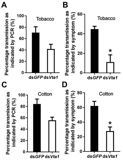 Effects of Vta1 knockdown on CLCuMuV transmission by Asia II 1. Whiteflies that had acquired CLCuMuV were collected and transferred to feed on tobacco (A,B) or cotton (C,D). On each of the two test plants, 3 replicates were conducted for both dsGFP and dsVta1, with each replicate containing 6–10 plants. * stands for significant difference (independent t-test, p < 0.05).
