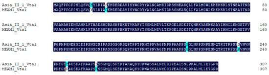 Comparison of amino acid sequences of Asia II 1 Vta1 and MEAM1 Vta1. Alignments were performed using DNAMAN. Dark blue indicates consensus in amino acids between the two sequences, and light blue or white indicates divergence in amino acids.