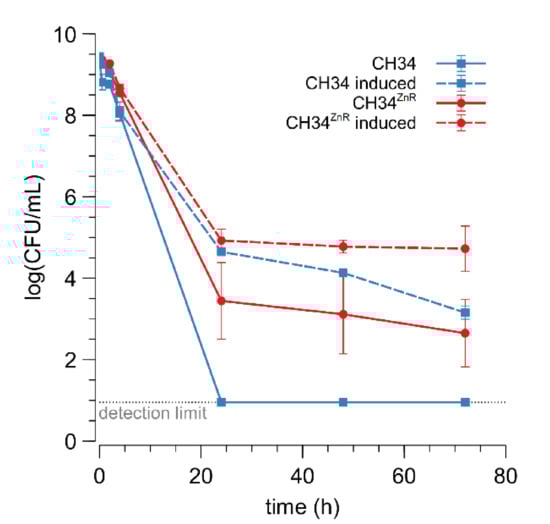 Cell survival upon exposure to 25 mM Zn2+ of C. metallidurans CH34 (blue square) and CH34ZnR (red circles) without (full) or with (dashed) pre-induction with 300 µM Zn2+ for 48 h. The light grey dotted line represents the detection limit. The average values of three independent experiments with standard deviations are shown. CFU: colony forming unit.
