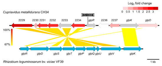 BLASTn comparison of the ABC-type transporter of C. metallidurans CH34/CH34ZnR and the glycerol utilization cluster of the plasmid pRleVF39c from R. leguminosarum bv. viciae VF39 (accession no. JN390944). The colored shading indicates nucleotide identity between the sequences. Coding sequences (CDSs) of C. metallidurans CH34 are color-coded based on their log2 fold change (CH34ZnR vs. CH34 expression), with grey being not detected. Insertion of IS1088 in glpR of CH34ZnR is shown.