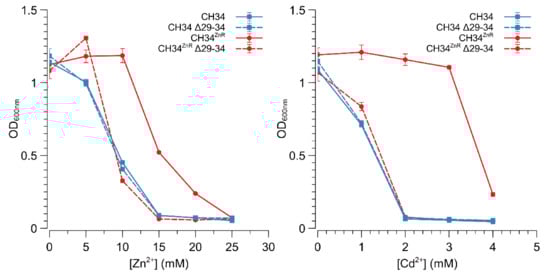 Zinc and cadmium resistance of C. metallidurans CH34 and its indicated derivatives. Zinc (left) and cadmium (right) dose–response experiments with CH34 (blue full line, squares), CH34ZnR (red full line, circles) and their Δ29-34 derivatives (blue dashed line with squares and red dashed line with circles, respectively). The average values of three independent experiments with standard deviations are shown.
