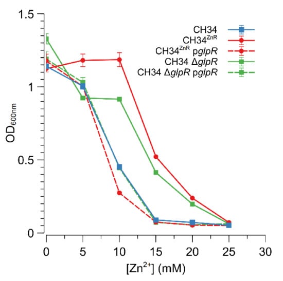 The Rmet_2229_2234 gene cluster was subsequently deleted by replacing it with a tetracycline resistance cassette (referred to as ∆29-34) in both CH34 and CH34ZnR to test the hypothesis that constitutive derepression of the ABC-type transporter is responsible for CH34ZnR’s increased zinc resistance. First of all, no differences in zinc and cadmium resistance could be observed between CH34 ∆29-34 and its parental strain, indicating that the native ABC-type transporter exerts no role in the detoxification of zinc or cadmium in the parental CH34 strain (Figure 3). However, when the Rmet_2229-2234 gene cluster was deleted in CH34ZnR, the zinc and cadmium resistance of the resulting CH34ZnR ∆29-34 mutant dropped to levels similar to those of the parental CH34, indicating that the ABC-type transporter is required for its increased zinc and cadmium resistance (Figure 3). In turn, deletion of the glpR gene in CH34 resulted in increased zinc resistance, while plasmid-based complementation of glpR reduced zinc resistance back to the parental level in both CH34 ΔglpR and CH34ZnR (Figure 4). The latter further confirms that loss of GlpR function results in increased zinc resistance.