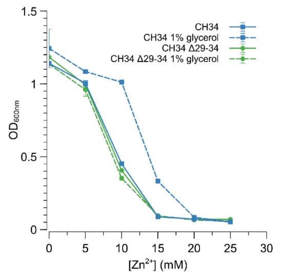 Impact of glycerol on the increased zinc resistance of C. metallidurans CH34. Dose–response experiments with CH34 (blue) and CH34 Δ29-34 (green) without (full line) and with (dashed line) 1% glycerol. The average values of three independent experiments with standard deviations are shown.
