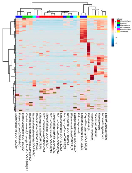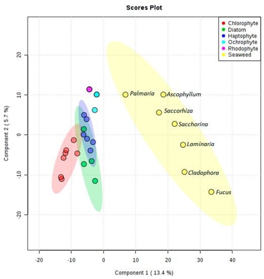 After establishing a phylogenetic relationship between microalgal strains based on 18S rRNA gene sequences, 20 strains of microalgae (seven Chlorophytes, four diatoms, six Haptophytes, two Ochrophytes, one Rhodophyte) and seven seaweed specimens were chosen for metabolomic comparison. Supervised statistical PLS-DA was used to compare the presence/absence and relative abundance of parent ions in each sample (Figure S1).