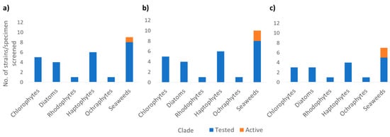 Bioassay screening results of extracts from each group tested (blue) and active (orange) for (a) endothelial lipase (EL), (b) proliferator-activated receptor alpha (PPARα), and (c) protein tyrosine phosphatase 1B (PTP1B). For the EL and PPARα assays extracts were selected as “active” if they fell within the mean plus 3 standard deviations of the distribution of % activity of vehicle control wells (Figure S3. For PTP1B assay A threshold of 60% inhibition was designated as “active”.