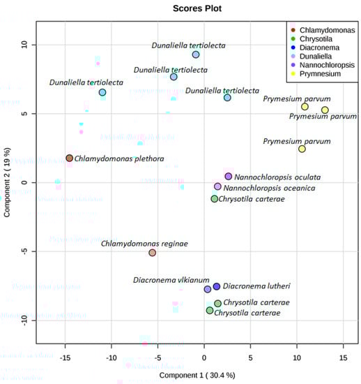 PLS-DA scores plot for Chlamydomonas spp. (red), Chrysotila carterae strains (green), Diacronema spp. (dark blue), Dunaliella tertiolecta strains (light blue), Nannochloropsis spp. (pink), and Prymnesium parvum strains (yellow) using component 1 (30.4%) and component 2 (19%) as axes.