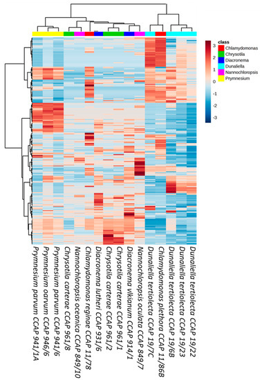 Unexpectedly, two species of Nannochloropsis (N. oceanica; hatchery, Norway, and N. oculata; lake of Tunis, Tunisia) clustered together in the PLS-DA scores plot despite the difference in the number of features detected (39 and 99, respectively). This difference is evident in the heatmap (Figure 7) with the following ions driving the variation between the two species; 455.2758 m/z, 317.2112 m/z, 183.6020 m/z, 367.2997 m/z, 383.3308 m/z, and 437.1515 m/z. The three marine strains of Dunaliella tertiolecta (CCAP 19/22, CCAP 19/23, and 19/6B) had similar chemical fingerprints, whilst CCAP 19/6B differed due to the absence of parent ions within the 202–370 m/z range (Figure 7).