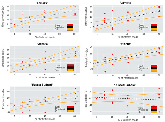 Correlation between (1) (left panels) emergence loss and infection percent of potato “Lamoka” (r = 0.66, p = 0.0017), “Atlantic” (r = 0.79, p < 0.0001), “Russet Burbank” (r = 0.60, p = 0.0056) seed pieces inoculated with Dickeya dianthicola; (2) (right panels) yield loss and infection percent of potato “Lamoka” (r = 0.66, p = 0.0014), “Atlantic” (r = 0.74, p = 0.0002), “Russet Burbank” (r = 0.13, p = 0.5850) seed pieces inoculated with Dickeya dianthicola. Predicted data and confident intervals (CI) were shown as the dash lines and orange curves, respectively, 2020.