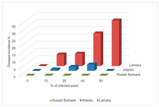 Disease incidence affected by infection of potato “Lamoka”, “Russet Burbank”, and “Atlantic” seed pieces inoculated with Dickeya dianthicola in 2019.