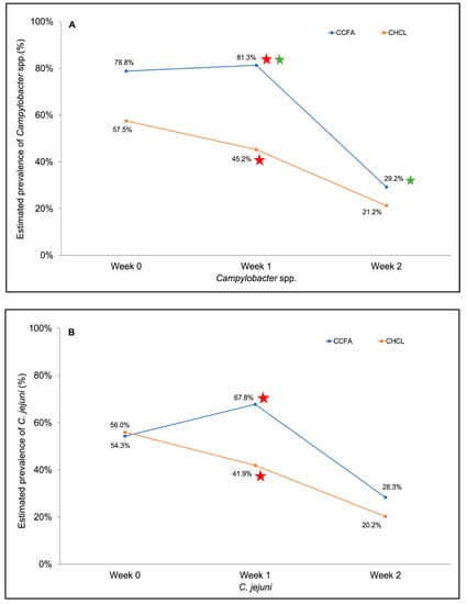 Estimated prevalence of (A) total Campylobacter spp. and (B) C. jejuni from the CCFA and CHCL groups. Red stars indicate a significant difference of estimated prevalence of Campylobacter spp. (p = 0.0009) or C. jejuni (p = 0.0184) between the CCFA and CHCL groups. Green stars indicate a significant difference (p = 0.0108) of the estimated prevalence of Campylobacter spp. between week 1 and 2 under CCFA treatment. Weeks 0, 1 and 2 correspond to pre-treatment (0 h), 12 h to day 7, and day 8, respectively. Data are based on CCFA and CHCL samples processed at 37 °C. Estimated prevalence determinations were performed as described in Materials and Methods.