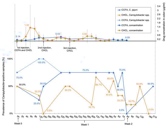 Drug concentrations in the colon and prevalence of Campylobacter-positive samples from the CCFA and CHCL groups. Upper panel, concentrations of CCFA (blue) and CHCL (orange). These drug concentration data were also presented earlier [17]. Lower panel, prevalence of Campylobacter spp. in CCFA (blue dashed lines) and CHCL (solid orange lines). Solid blue lines indicate prevalence of C. jejuni in the CCFA samples. C. jejuni prevalence in CHCL is not shown, as it was almost identical to total Campylobacter spp. Prevalence data are based on CCFA and CHCL samples processed at 37 °C. The concentrations of the drugs in the colon and prevalence of Campylobacter spp. and C. jejuni were determined as described in Materials and Methods.