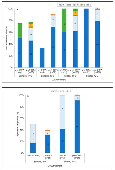Prevalence of different species and antimicrobial resistance (AMR) profiles in Campylobacter samples and isolates from (A) CCFA and (B) CHCL groups. Species-AMR combinations are as in inset where CJ, CH, and CF indicate C. jejuni, C. hyointestinalis, and C. fetus, respectively. AMR abbreviations: TK, resistance only to tetracycline and kanamycin; PS, pan-susceptible; TN, resistance only to tetracycline and nalidixic acid; N, resistance only to nalidixic acid. Pre-CHCL or -CCFA referred to 0 h, while post-CHCL or -CCFA was a compilation of all sampling points after 0 h. A total of 12 samples from CCFA (seven at 37 °C and five at 42 °C, all post-treatment) and six from CHCL (post-treatment) yielded both C. jejuni TK and C. jejuni PS. “Samples” and “Isolates” are defined as described in the legend of Figure 1. Campylobacter detection from the fecal samples and determination of species and AMR profiles were as described in the Materials and Methods.