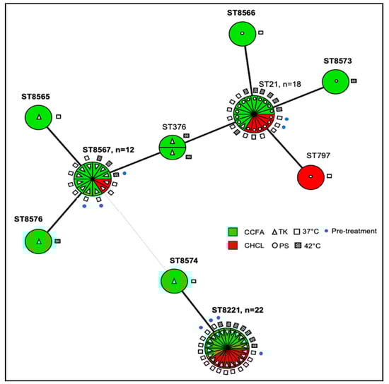 Minimum spanning tree (MST) demonstrating multilocus sequence typing (MLST)-based sequence types (STs) in C. jejuni from the CCFA and CHCL treatment groups. Each ST is represented by a circle, and partitions within each circle represent individual isolates with the respective ST. Circles without partitions (e.g., ST-797) indicate STs encountered only once. Green and red indicate the CCFA and CHCL group, respectively. AMR profile abbreviations: TK (rectangles), resistance only to tetracycline and kanamycin; PS (circles), pan-susceptible. Open and gray rectangles represent isolates obtained at 37 °C and 42 °C, respectively, and blue dots represent isolates recovered pre-treatment. Solid lines connect STs with a single-locus difference. The dashed line represents three or more allele differences, i.e., a different clonal complex (CC). STs above the dashed line belong to CC21, while the two STs below the dashed line belong to CC61. Novel STs are in bold. MLST analysis and MST construction were as described in Materials and Methods.