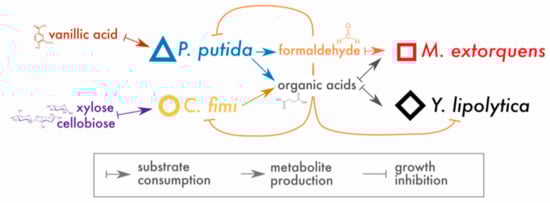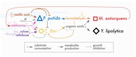 A valuable lesson learned from this study relates to the prevalence of unexpected ecological interactions that may be discovered even in a simple three-species community (Figure 10). Dynamics we discovered that were not originally predicted included the dramatic interspecies differences in nutritional needs, individual growth rates, pH sensitivity, and tolerance to toxins such as formaldehyde and vanillic acid. Some of these differences may provide clues about the organisms’ ecological niches. For example, formaldehyde tolerance shows a link to species’ metabolic capabilities: in M. extorquens, a methylotroph, formaldehyde is detoxified by the dephospho-tetrahydromethanopterin pathway [,], and vanillic-acid-consuming P. putida carries a set of redundant glutathione-dependent formaldehyde dehydrogenases []. However, in C. fimi, to our knowledge, formaldehyde detoxification has not been characterized. Another complication in our understanding of the community’s dynamics was the consumption by P. putida of compounds (iron and methionine) seemingly in excess of what was limiting for its growth. Critically, very little about these findings would be captured by genome-scale metabolic modeling, a method often based on the assumption that each member achieves optimal metabolism on the available substrates []. Our results point to the importance of taking into account traits outside of metabolism for their roles in interspecies interactions. As many model experimental systems in microbial ecology focus primarily on metabolite exchange and chemical warfare (e.g., [,,,]), our microbial consortium could prove a useful model for the study of alternative modes of ecological interactions.