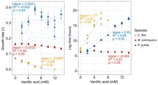 Because P. putida can grow on vanillic acid as a sole carbon source and would be required to do so in our consortium, we tested its growth tolerance to a range of vanillic acid concentrations while using the compound as its sole carbon substrate. For the other organisms, we were required to provide an alternative growth substrate in addition to the vanillic acid (see Table S1 for details). Remarkably, vanillic acid had a very small effect on the growth rate (slope = −0.0032, p < 0.05), and no detectable effect on the lag time, for M. extorquens, up to 14 mM (Figure 2). However, vanillic acid did inhibit the growth of both C. fimi and P. putida; both organisms showed a significant increase in lag time (slope = 1.77 and 0.93, respectively; p < 0.05), and C. fimi showed a decrease in growth rate (slope = −0.0097, p < 0.05), with increasing vanillic acid concentrations (Figure 2, Figure S2). For C. fimi, no growth was detectable at 14 mM vanillic acid and it was not possible to calculate lag time above 8 mM.