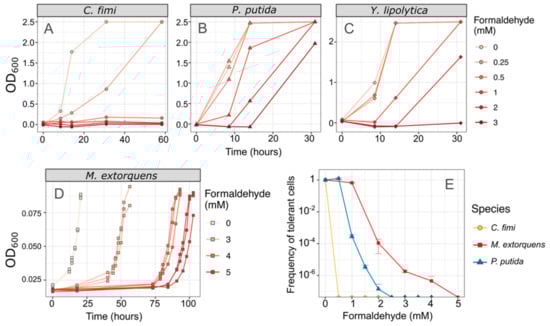 C. fimi is the most formaldehyde-sensitive member of the consortium. (A–D) Each species was grown in pure culture in minimal medium with varying concentrations of formaldehyde, and growth monitored by OD600. No growth was observed in C. fimi at concentrations of 0.5 mM or higher, whereas Y. lipolytica grew at up to 2 mM formaldehyde and P. putida at up to 3 mM within 30 h. Note that OD is shown here on a linear scale for ease of interpretability; note also that the color scale for formaldehyde concentrations is different between panels (A–C) and panel (D). Data from panel (D) are reproduced from []. (E) An alternative method of understanding formaldehyde tolerance is the enumeration of cells that are able to form colonies on agar medium containing formaldehyde. In M. extorquens, 100% of the plated population formed colonies at 1 mM and 1/10,000 formed colonies at 2 mM. P. putida cells also formed colonies at those concentrations but at a lower frequency. In C. fimi, no colonies were observed at 0.5 mM formaldehyde or higher. Error bars show the standard deviation of three replicate platings.
