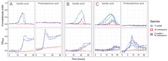 3.2. M. extorquens Reduces the Formaldehyde Concentrations in Cocultures Growing on Vanillic Acid