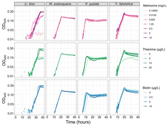 Vitamin and amino acid supplements have minimal effect on growth rates of each of the consortium members, except for C. fimi. Each species was grown in pure culture in minimal medium with a range of concentrations of methionine, thiamine, or biotin. For the methionine experiment, all cultures contained 25 µg/L thiamine and 10 µg/L biotin; for the thiamine experiment, 10 mg/L methionine and 10 µg/L biotin; for the biotin experiment, 10 mg/L methionine and 25 µg/L thiamine.