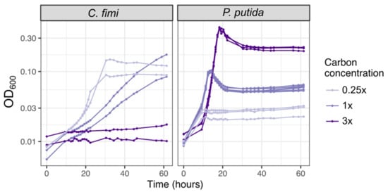 Higher carbon concentrations in model lignocellulose medium result in slower growth and higher final yield; C. fimi is more strongly inhibited than P. putida. Each species was grown in pure culture in Model Lignocellulose medium (Table 1) with either 1× carbon (4 mM cellobiose, 5 mM xylose, 4 mM vanillic acid), or 0.25 times or 3 times those concentrations.