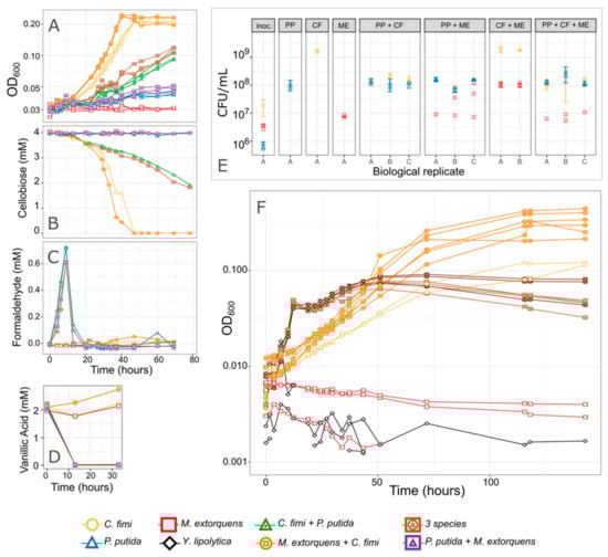 We developed methods to measure the production and consumption of all the compounds of interest: a colorimetric method for formaldehyde, GC-MS for vanillic acid, and HPLC for cellobiose and xylose. We also explored ways to measure the dynamics of individual species as they grew together in liquid co-culture. While we were unable to distinguish among species using flow cytometry, they were easily distinguished by colony morphology when plated onto agar medium (Figure S1). Furthermore, because C. fimi, M. extorquens, and P. putida had such distinctive growth rates, each formed a different part of the growth curve, and it was, therefore, possible to make an initial qualitative assessment of culture dynamics based on optical density alone. In general, P. putida was recognized as the earliest, most rapid part of the growth curve, which was followed by a slight dip in OD once P. putida had exhausted its carbon substrate (likely due to accumulation we observed of P. putida cells on the walls of the culture vessel, or to change in cell shape as has been observed for M. extorquens []). C. fimi growth, being much slower, was recognized as the slower growth becoming prominent well after P. putida reached its maximum. With its moderate growth rate, M. extorquens was recognizable as any increase in the growth curve relative to the C. fimi growth alone—though some of that increase in OD may also have been attributable to a stimulation of C. fimi growth by M. extorquens. An example of these dynamics is visible in Figure 7.