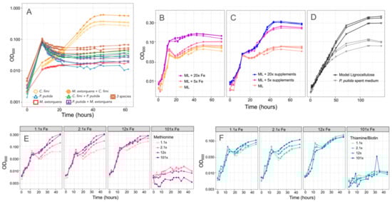 There are multiple potential explanations for the inhibitory effect of P. putida on C. fimi growth. (A) Growth of individual species and combinations (denoted by color and shape of plot symbol) on Model Lignocellulose medium in which vanillic acid is replaced by protocatechuic acid, which does not result in formaldehyde production. Cultures with P. putida still show slower growth than those without. (B,C) Effect of increasing the iron or supplements (methionine, thiamine, and biotin) in the medium. In both cases, higher concentrations support more growth. (D) Growth of C. fimi alone on either Model Lignocellulose or P. putida spent medium: a lower final yield is reached on spent medium. (E,F) Growth of the model community (P. putida, C. fimi, M. extorquens) on combinations of different iron (panels), methionine (color scale), and thiamine + biotin (color scale) concentrations.