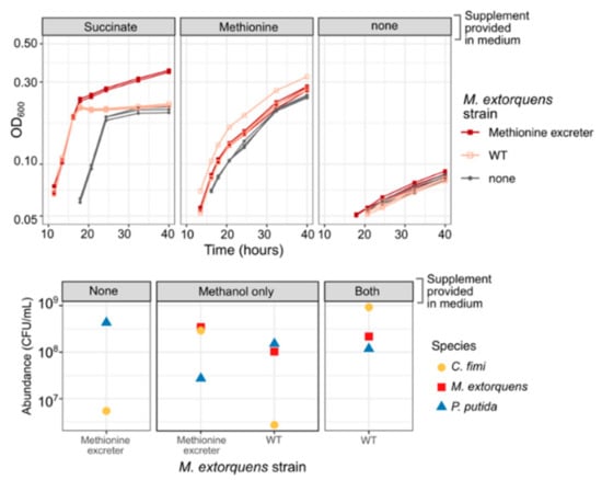We used a previously published method to generate a methionine-overproducing strain of M. extorquens by selecting on medium containing ethionine [,]. When we cultured this M. extorquens strain with C. fimi, or both C. fimi and P. putida, in medium without added methionine, we found that it was able to support the growth of C. fimi to abundances similar to or better than those supported by 20 mg/L methionine (Figure 9). This effect was unique to the overproducing strain: wild-type M. extorquens did not promote C. fimi growth. Moreover, the effect was dependent upon the presence of either methanol or succinate to support the growth of the methionine producer (Figure 9), indicating that the benefit required having a high abundance of growing M. extorquens cells. The inclusion of a methionine-overproducing strain in the consortium might therefore prove to be a remedy to resolve one of the several interactions between C. fimi and P. putida—the competition for methionine.