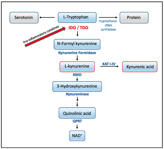 It is well known that pro-inflammatory cytokines induce tryptophan degradation via a cascade of enzymatic steps known as the “kynurenine pathway” [] (see Figure 1). Several studies demonstrate that induction of the kynurenine pathway during infection represents a fine-tuned system for regulating both microorganisms as well as directly interfering with the immune system. Recent evidence indicates that kynurenine acts as a high-affinity ligand of the aryl hydrocarbon receptor and stimulates immunosuppressive properties []. In addition, kynurenine triggers regulatory T cell development [] and some of the other tryptophan metabolites such as 3-hydroxyanthranilic and quinolinic acid (QUIN) trigger apoptosis in Th1 cells []. Furthermore, during infection, the kynurenine pathway suppresses the replication of microorganisms by depleting the intracellular sources of tryptophan [].