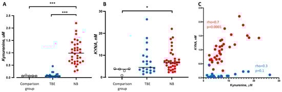 CSF concentrations of kynurenine or KYNA were not statistically significant different between children with TBE (kynurenine: 0.06 μM, IQR 0.04–0.1 μM, n = 21, p = 0.7, KYNA: 4.5 nM, IQR 2.9–9.6 nM, n = 21, p = 0.1, see Figure 2A,B) and children included in the comparison group (kynurenine 0.06 μM, IQR 0.06–0.08 μM, n = 5 and KYNA 3.7 nM, IQR 1.8–3.8 nM, n = 5, see Figure 2A,B). In contrast, kynurenine concentrations were markedly increased in children with NB (kynurenine: 0.99 μM, IQR 0.7–1.3 μM, n = 34, p < 0.0001 and KYNA: 6.6 nM, IQR 4.6–8.9 nM, n = 34, p = 0.005 see Figure 2A,B) compared to the comparison group. Kynurenine was statistically significantly increased in patients with NB compared to children with TBE (p < 0.0001, see Figure 2A). Kynurenine correlated positively with KYNA in children with NB (Spearman’s rho = 0.7, n = 34, p = 0.0001, see Figure 2C) but not in children with TBE (Spearman’s rho = 0.1, n = 21, p = 0.3, see Figure 2C).