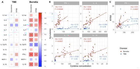 (A). Heatmaps of Spearman correlation coefficients between CSF tryptophan metabolites kynurenine, kynurenic acid (KYNA) and CSF cytokines in children with neuroborreliosis (NB, n = 28) and tick-borne encephalitis (TBE, (n = 22). Positive correlations (blue), Negative correlations (red). (B) Correlation between concentrations of kynurenine and IFN-γ, interleukin (IL)-8, IL10 and IL-18 and (C) Correlation between concentrations of KYNA and interferon (IFN)-γ in children with NB (red circles) and TBE (blue circles). Spearman rank correlation analysis (rho). Alpha threshold is set to *** p < 0.001, ** p < 0.01, * p < 0.05.