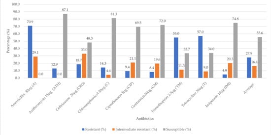 - Clinical and Laboratory Standard Institute. Document M100. Performance Standards for Antimicrobial Disk and Dilution Susceptibility Tests for Bacteria Isolated from Animals, 27th ed.; Approved Standard; Clinical and Laboratory Standard Institute: Wayne, PA, USA, 2017. [Google Scholar]
